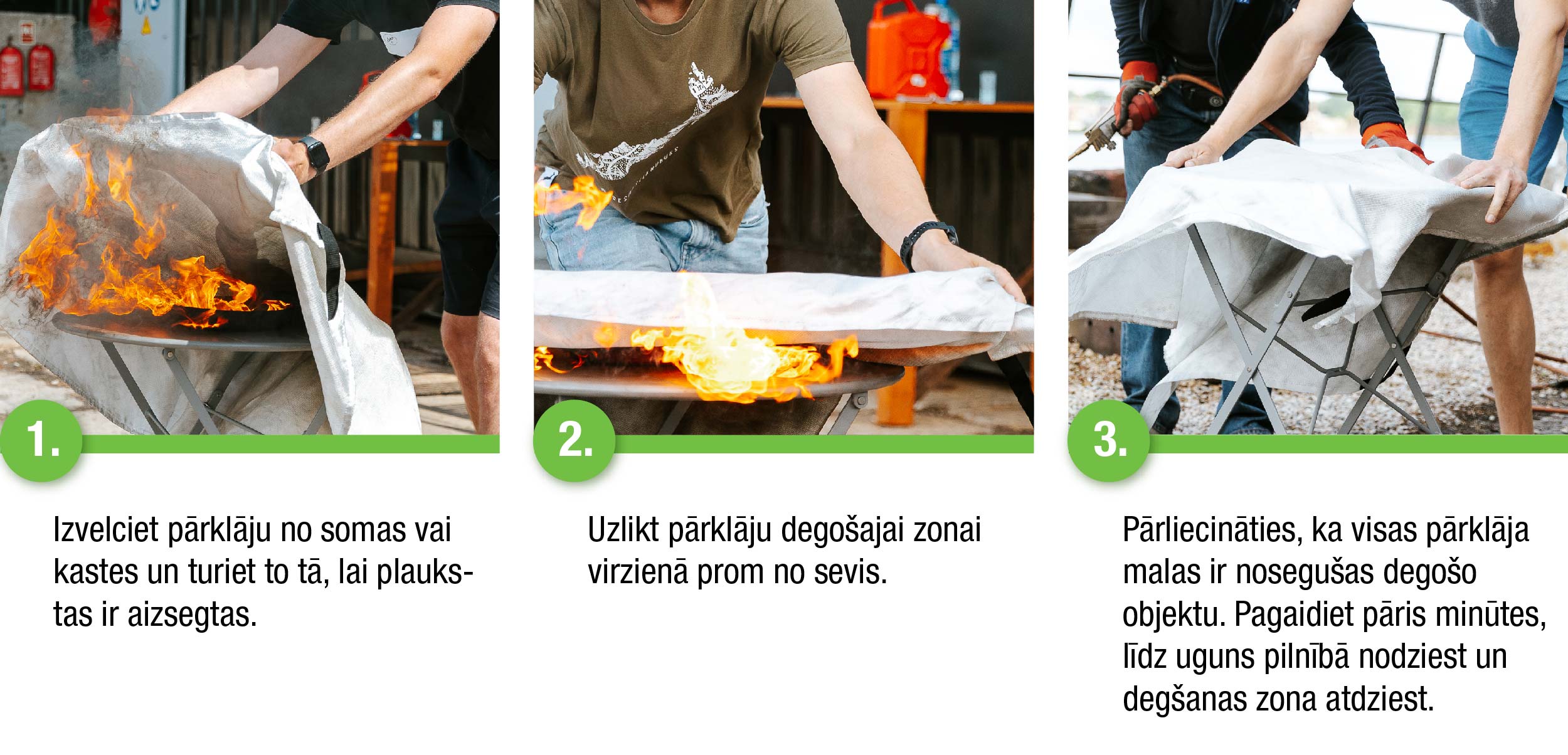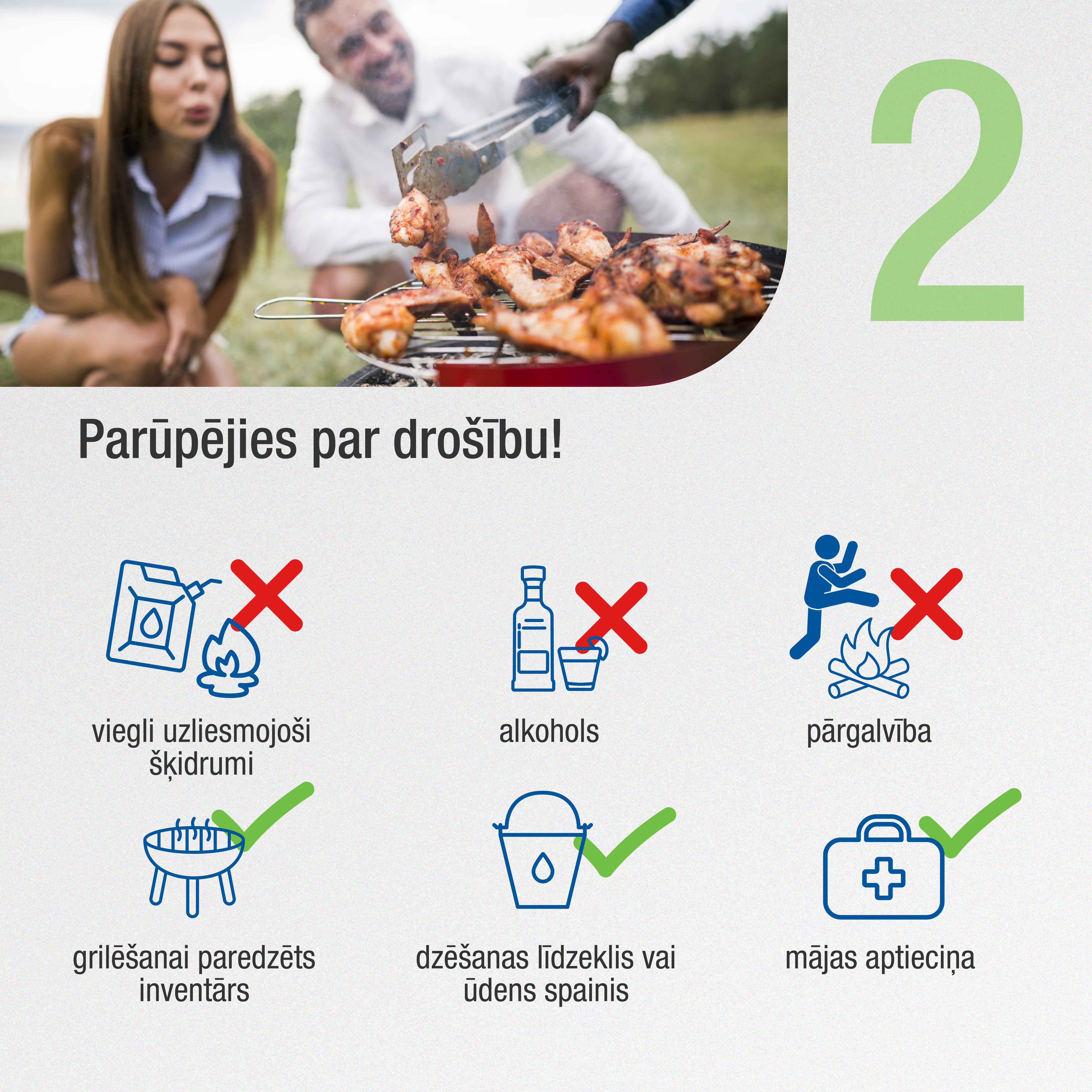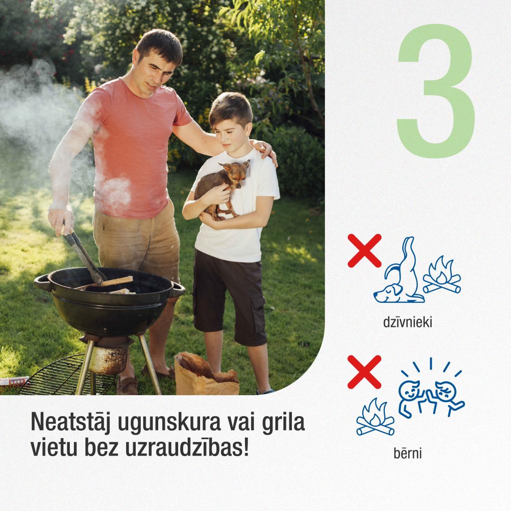 Netuvoties ugunskura un grila liesmām, ja mugurā ir sintētiska materiāla drēbes, kas viegli un ātri aizdegas. Gatavojot maltīti, izmanto tikai grilēšanai paredzēto inventāru un karstuma izturīgos cimdus, lai pasargātu sevi no apdegšanas riskiem.