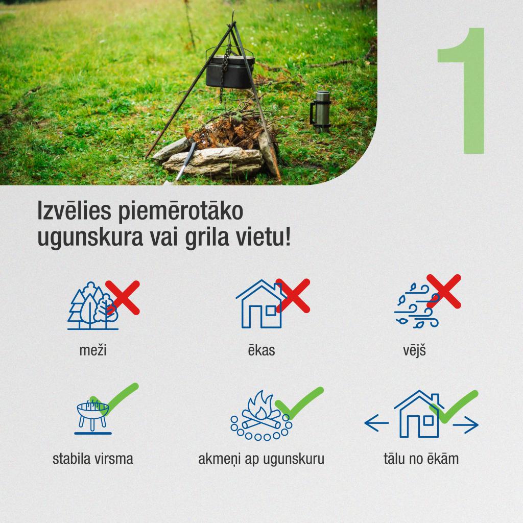 Kurinot ugunskuru vai grilu, ieteicams ņemt vērā vēja virzienu, lai dzirksteles nenokļūtu līdz degošām virsmām, kokiem, krūmiem, utt, kā arī nededzināt tos ar viegli uzliesmojošiem šķidrumiem, piemēram, benzīnu, acetonu u.c; Noteikti nedrīkst dedzināt sintētiskos materiālus, gumijas riepas un tamlīdzīgas lietas, kas degot izdala indīgas vielas. Grila un ugunskura iededzināšanu nekādā gadījumā neuzticiet bērniem.