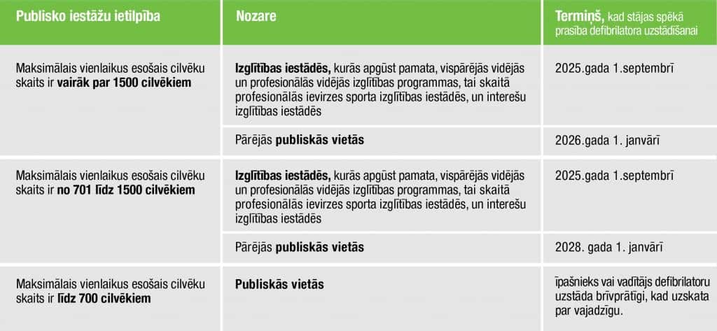 Svarīgi arī pievērst uzmanību noteikumiem par defibrialtoru iekārtu izvietošanas daudzumu objektā attiecīgi cilvēku skaitam!