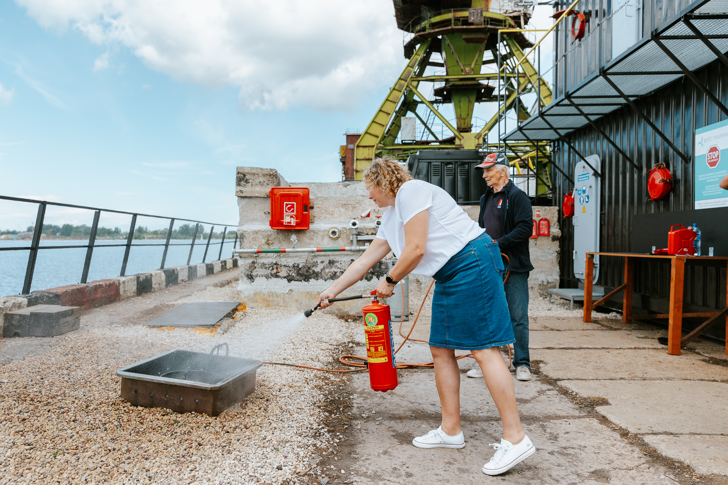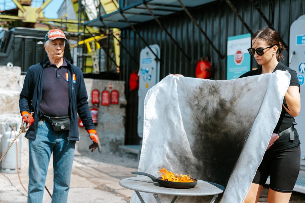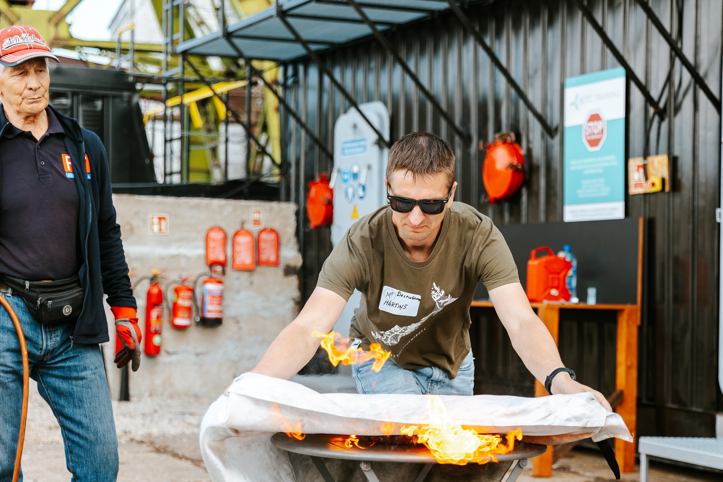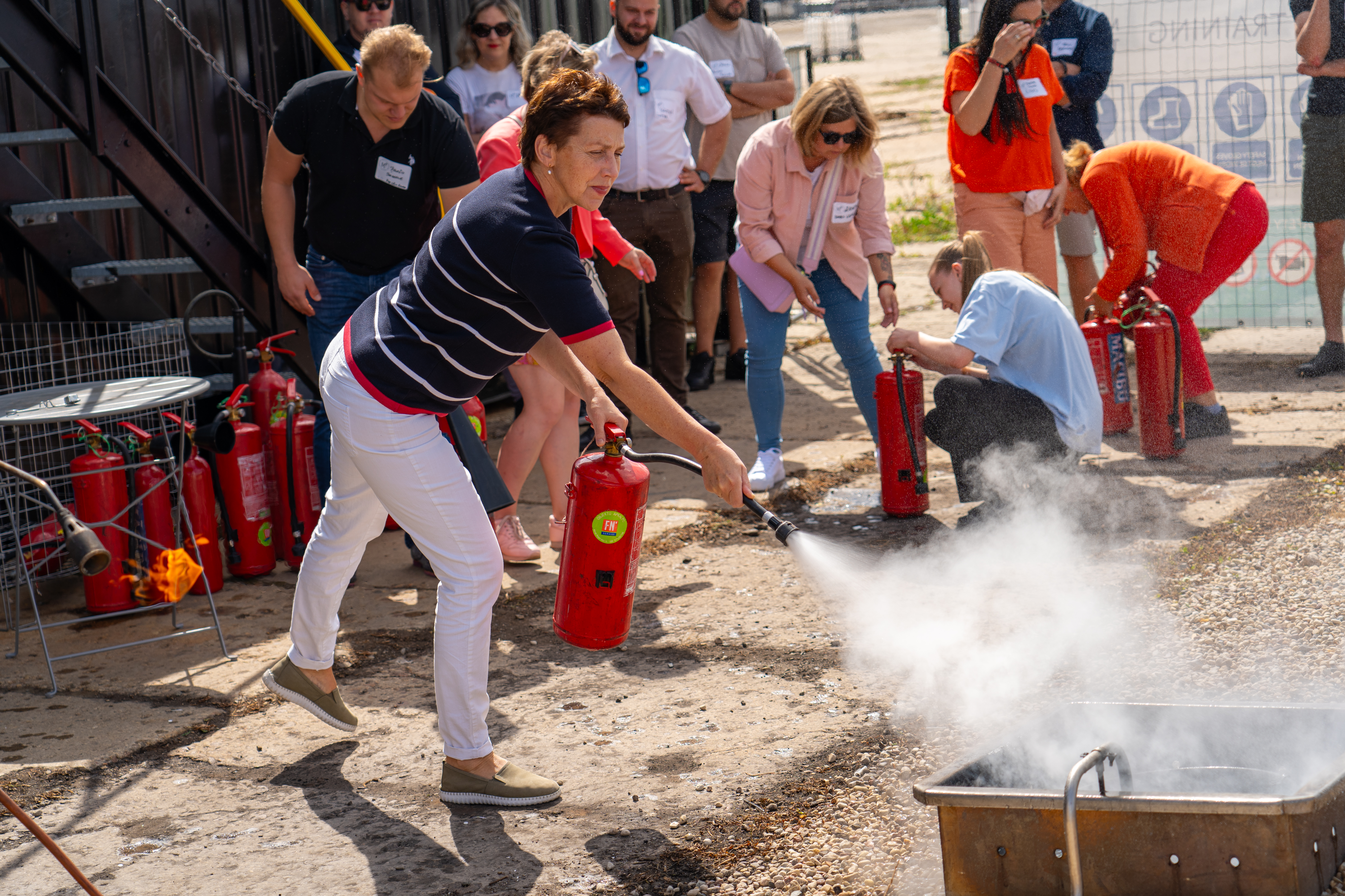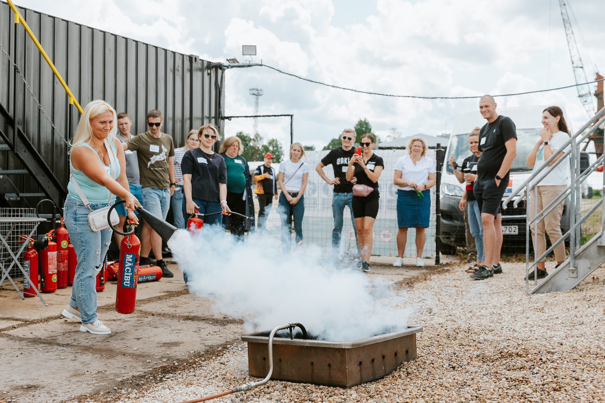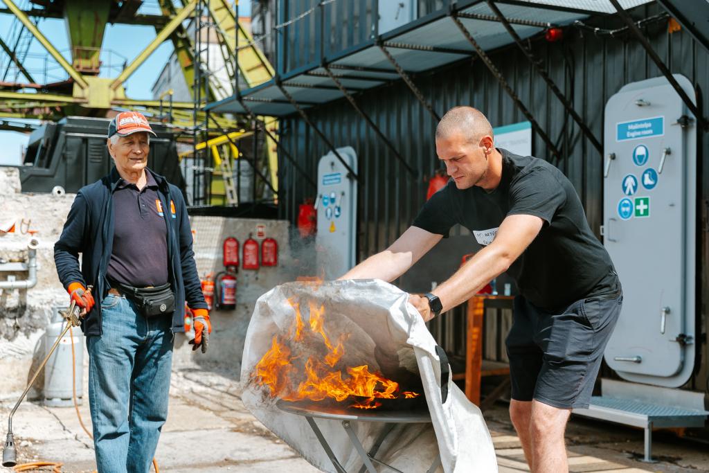 Tikpat aktīvi pasākuma dalībnieki iesaistījās arī īstas liesmas dzēšanas treniņos, izmēģinot tās dzēst gan ar īstiem ugunsdzēsības aparātiem, gan ugunsdzēsības pārklāju. Izmēģinot praktisko treniņu, tika radīts priekšstats, kā FN-SERVISS profesionāļi praktiskās nodarbības ugunsdrošībā organizē saviem klientiem.