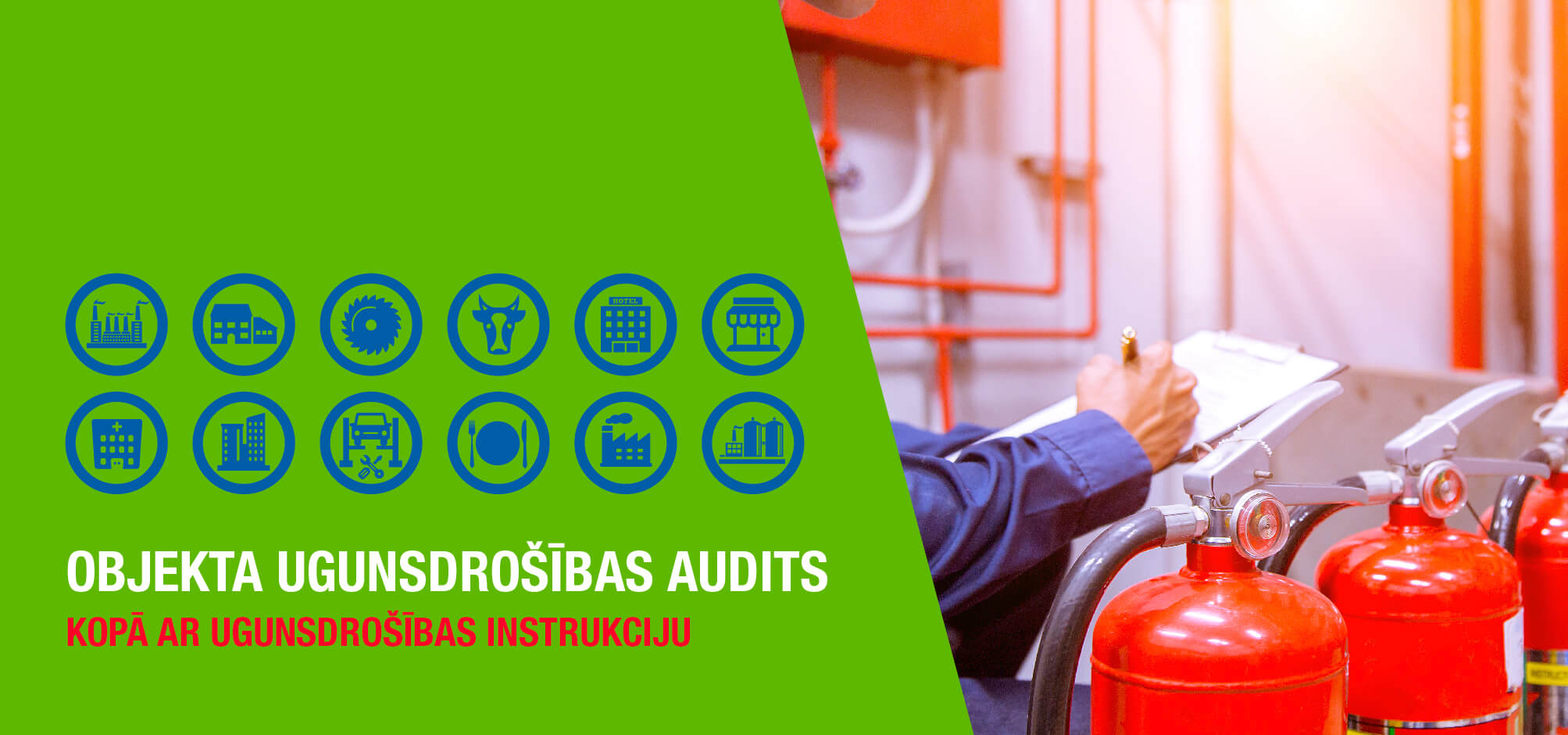 Lai palīdzētu Jums izveidot ugunsdrošu darba vidi, esam radījuši pakalpojumu  UGUNSDROŠĪBAS AUDITU KOPĀ AR INSTRUKCIJAS IZSTRĀDI.