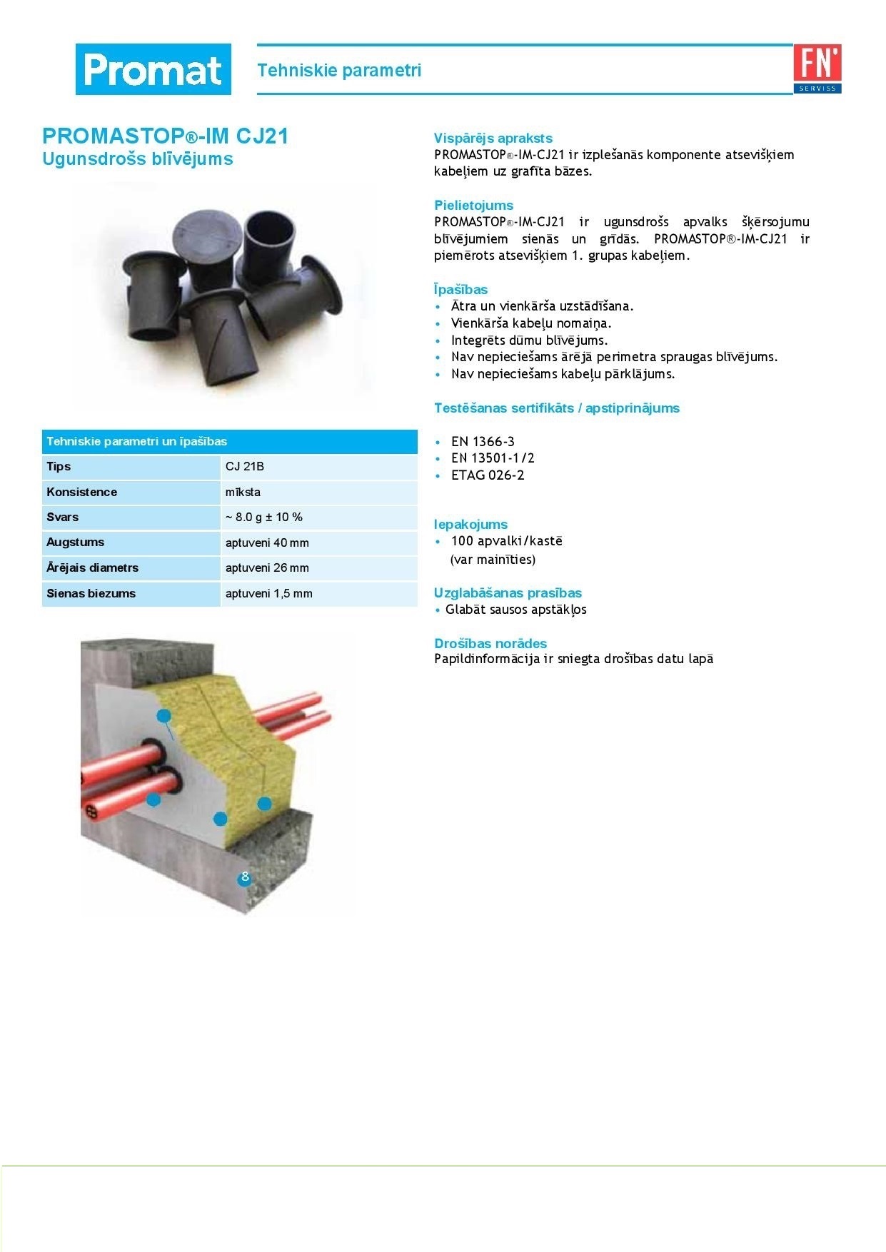PROMASTOP IM CJ21 ir ugunsdrošs apvalks šķērsojumu blīvējumiem sienās un pārsegumos. PROMASTOP IM CJ21 ir piemērots atsevišķiem 1. grupas kabeļiem un tā saucamajām kabeļu “gofrām”.
