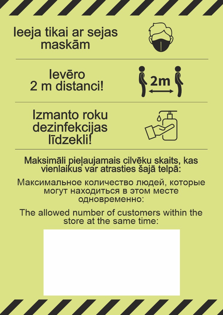 Informatīva un universāla uzlīme, kas noderēs ikvienam veikalu, klientu apkalpošanas centru vai citu publisku telpu īpašniekam, lai izpildītu valstī noteiktās prasības Covid-19 vīrusa ierobežošanai.