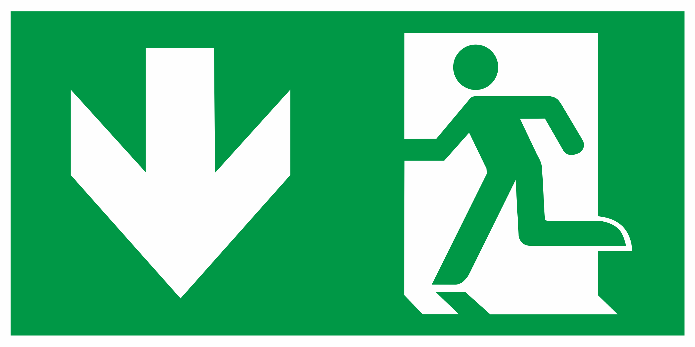 Uzlīme “IZEJA uz leju pa kreisi”, papildus uzlīme OXIMIA LED evakuācijas un avārijas apgaismojumam.