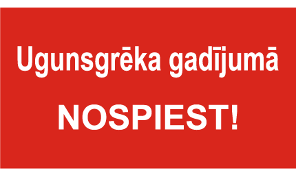Zīme atbilstoši 03.09.2002 MK peņemtajiem LVS “Ugunsdrošībai un civilai aizsardzībai lietojamās drošības zīmes un signālkrāsojums” normatīviem.