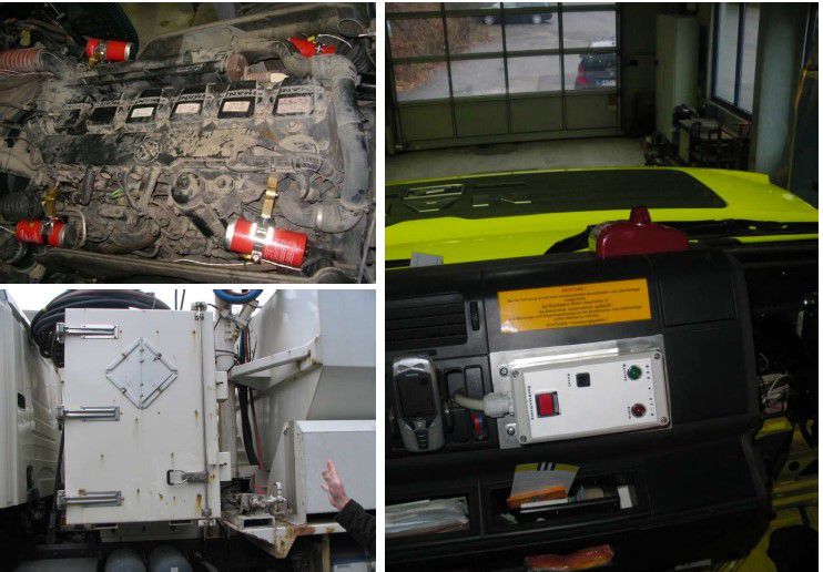 Piemēri, kā izskatās transporta motortelpas, kas aprīkotas ar aerosolu ugunsdzēsības sistēmām no DYNAMECO