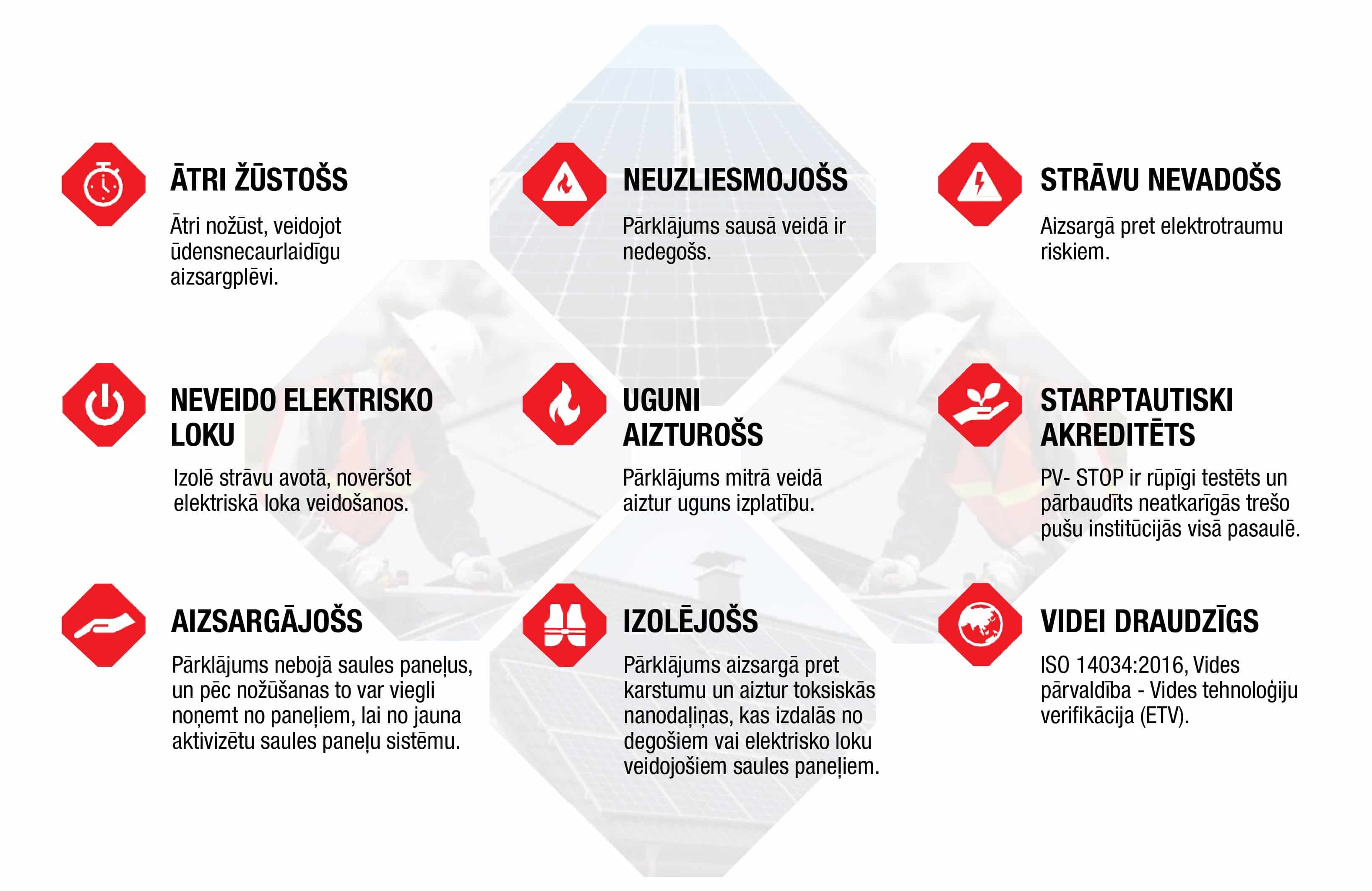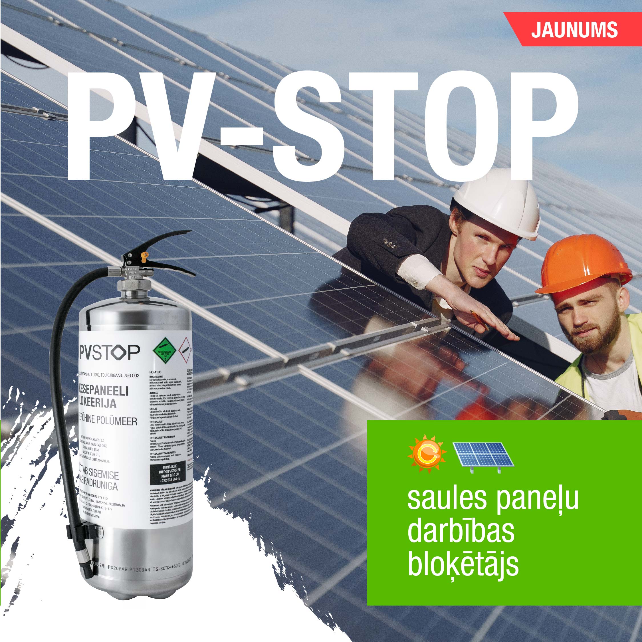Saules paneļu darbības bloķētājs PV- STOP ir vienkāršs risinājums sarežģītai un tehniskai problēmai.  Tas ir vienīgais līdzeklis, kas bloķē gaismu un "izslēdz" saules paneļus dažu sekunžu laikā, padarot sistēmu elektriski drošu.